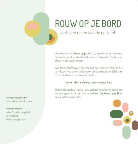 Samen eten, in een besloten ruimte, en op adem komen. Dat is de kern van Rouw op je bord. Gewoon je hart luchten en in alle openheid kunnen vertellen hoe dat was: je verloor je broer of zus en vanaf toen was alles anders.